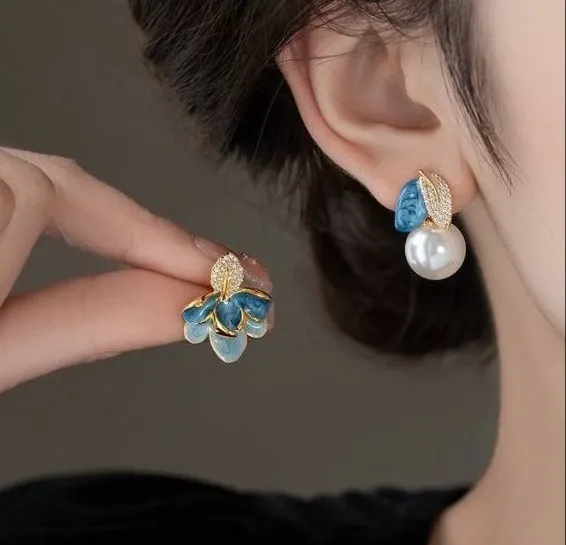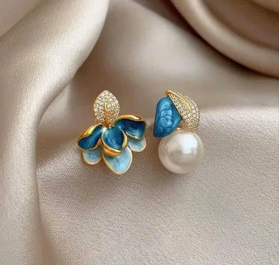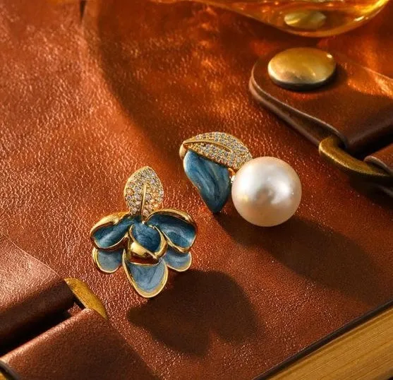 The floral element is crafted with vibrant blue enamel work, highlighted with smooth gold-plated outlines that bring a touch of luxury. The other piece is finished with a lustrous pearl and a textured leaf, accentuated with tiny zircon-like stones that add a soft sparkle. Together, they create a beautifully balanced and eye-catching look.