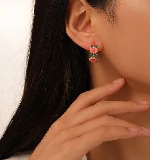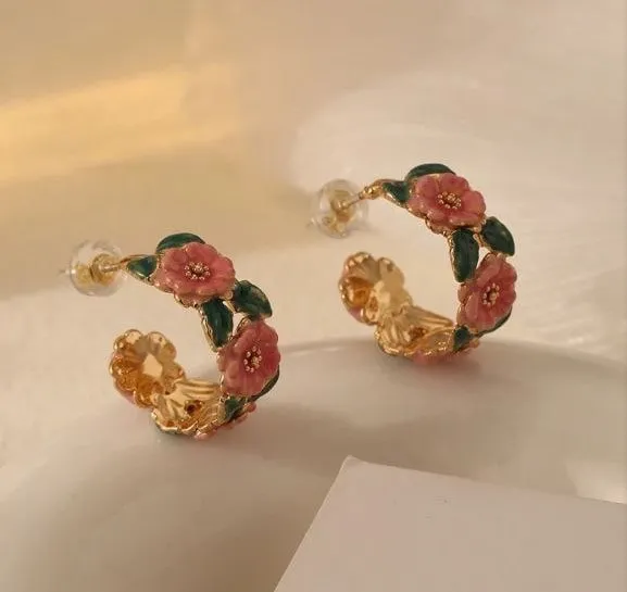 Each hoop is designed with fine craftsmanship, showcasing hand-painted floral patterns that give it a unique and artistic look. The french style enamel flowers are complemented by green leaf accents, all delicately arranged on a gold-toned base that enhances their vibrancy. Their intricate yet lightweight design makes them a perfect choice for long wear without any discomfort.