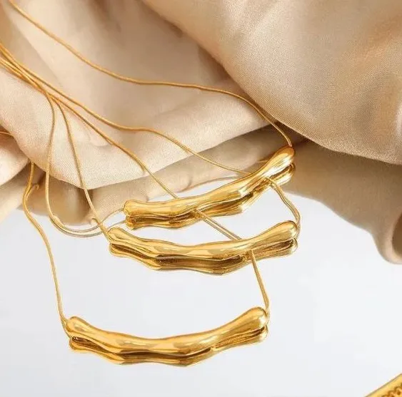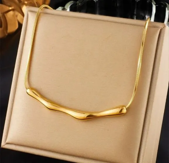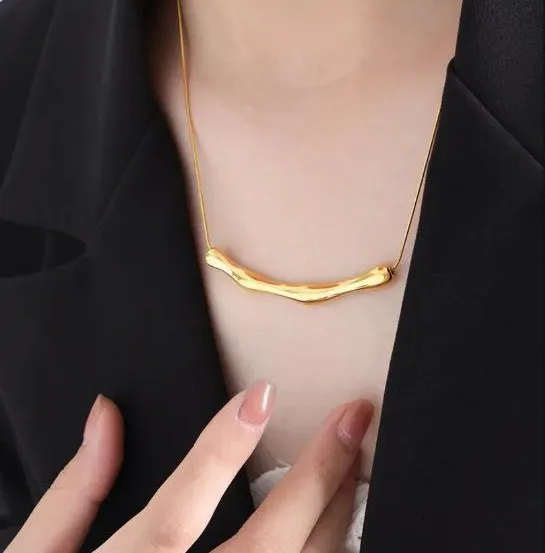 This Irregular Bar Bamboo Pendant Necklace is a sleek, modern statement piece inspired by natural bamboo. Crafted from 316L titanium stainless steel and finished with 18K gold color plating, it’s waterproof, anti-tarnish, and PVD plated for extra durability. The smooth snake chain complements the organic pendant shape, creating a refined and elegant look. Perfect for layering or wearing solo for a bold, minimalist touch.